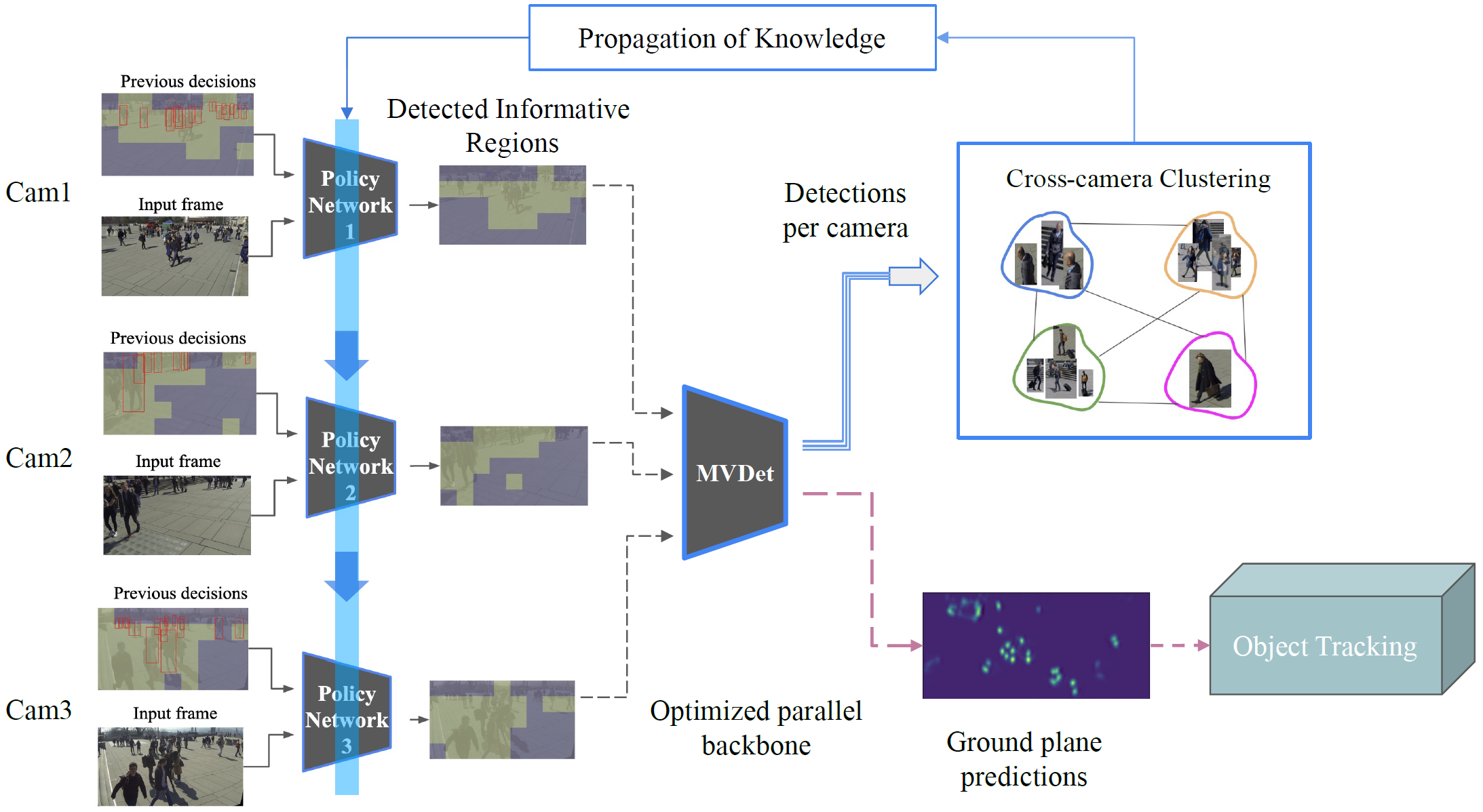 Tracking people in multi-camera surveillance systems is challenging due to disparate perspectives, large volumes of data, and high computation demands. This paper presents a distributed cooperative pipeline for pedestrian tracking that exploits the spatial and temporal redundancy within and across the video feeds from multiple synchronized cameras. It consists of three key components: 1) a lightweight policy network trained online in a self-supervised manner on each camera, 2) a sparse backbone processing unit purpose-built for parallel processing of selected regions of all cameras, and 3) an online clustering algorithm for object association. Utilizing online distributed reinforcement learning, the fully end-to-end trainable pipeline can accelerate any tracking-by-detection method by reducing detection costs across multiple perspectives. MVSparse has been evaluated using two multi-camera multi-target pedestrian tracking datasets, WildTrack and MultiviewX. It reduces the amount of processed regions by up to 52% and 39% with only moderate degradation of 1% and 0.1% in tracking accuracy on the two datasets, respectively. On a real-world testbed comprising four NVIDIA Jetson TX2 and a GPU server, MVSparse accelerates the end-to-end process and reduces the communication overheads by 1.88 and 1.60 X with only 2.27% and 3.17% degradation in tracking accuracy on the two datasets, respectively.